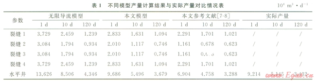 分別按照裂縫無限導(dǎo)流模型、本文模型以及本文參考文獻(xiàn)[7-8]的計(jì)算結(jié)果與實(shí)際產(chǎn)量對(duì)比(表1)??梢钥闯觯疚哪P偷挠?jì)算結(jié)果從初期到穩(wěn)定生產(chǎn)階段最接近,表明本文模型準(zhǔn)確性高。從3種模型計(jì)算結(jié)果的對(duì)比來看:無限導(dǎo)流模型計(jì)算生產(chǎn)ld時(shí)的產(chǎn)量為13.626×104m3/d、生產(chǎn)120d后產(chǎn)量為4.346×104m3/a,遠(yuǎn)高于實(shí)際產(chǎn)量,表明不能忽略裂縫內(nèi)壓力損失的影響。從本文參考文獻(xiàn)[7-8]模型的計(jì)算結(jié)果與實(shí)際產(chǎn)量對(duì)比可以看出,生產(chǎn)初期差別較大(分別為6.904×104m3/a和9.214×104m3/d),而在生產(chǎn)120d的差別變小,這表明采用均勻產(chǎn)量分布的假設(shè)與實(shí)際情況存在較大偏差。