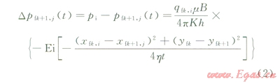 平面直角坐標(biāo)系下,設(shè)在裂縫k上有一線匯M(x2fk,i,ykf)(產(chǎn)量為qfk,i),在裂縫k+1上有一觀察點(diǎn)位于O(xfk+,j,yfk+1),線匯qfk,i連續(xù)生產(chǎn)時(shí)間t后在O點(diǎn)產(chǎn)生的壓力降落為: