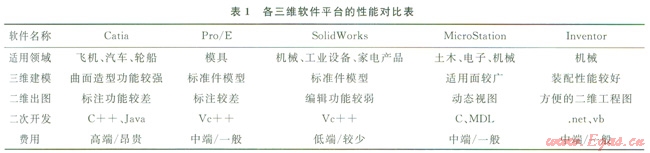 針對所要開發(fā)的系統(tǒng)功能要具有:①參數(shù)化的模型庫;②模型庫設備的添加、瀏覽、刪除、編輯等;③自動管路設計;④材料表統(tǒng)計;⑤自動出圖;⑥有限元分析接口以及ROV的干涉檢測等。通過表l和圖l對Inventor、Catia、SolidWorks、Pro/E和Microstation等常用三維建模軟件平臺的用戶數(shù)量、適用領域、功能特點以及其經(jīng)濟性等數(shù)據(jù)進行比較,最終選取了Autodesk Inventor作為水下生產(chǎn)虛擬仿真設計系統(tǒng)的開發(fā)平臺。