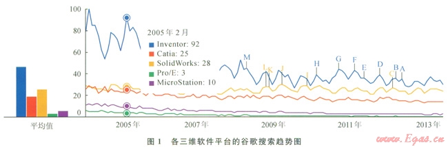 Inventor作為Autodesk公司推出的一款三維可視化軟件,具有三維建模、協(xié)同工作、信息管理和技術支持等強大功能,在該平臺可以實現(xiàn)創(chuàng)建三維模型、二維工程圖,其具有的連接網(wǎng)絡功能可以進行同項目組員間的協(xié)同,為同項目組人員間數(shù)據(jù)共享和思想交流提供了極大方便。另外,通過谷歌趨勢檢索比較圖l,從另一個側(cè)面也反映出了該軟件具有更高的關注度和更大的應用范圍。