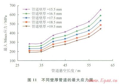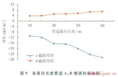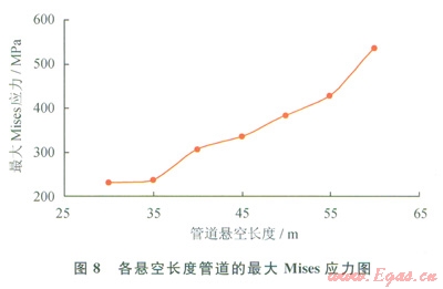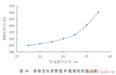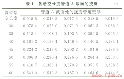 2)保持其他工況參數不變,改變懸空長度分別為35m、40m、45m、50m、55m、60m時,汁算管道最大應力、彎矩和撓度(見圖8~10和表l)??梢姡航孛?span lang="EN-US">A處撓度最大,截面B處剪力最大,管道易在截面B處發(fā)生剪力破壞。當懸空長度為55m時,管道已接近失效上限,仍處于安全范圍。60m時,管道最大應力大于485MPa,此時管道失穩(wěn),超出安全極限,理論上已失效。