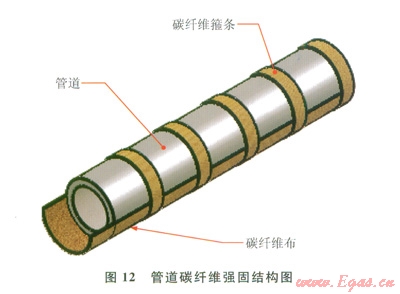 碳纖維材料的多項力學指標優(yōu)于鋼材,圖l2為碳纖維布粘貼在管道下半圓周面示意圖。用間距分布的環(huán)形碳纖維箍條周向預緊粘貼,箍條有助于防止下部碳纖維布剝離管道,同時在預緊力的作用下使碳纖維布與管道粘貼更緊密,且使強固材料對管道有了一定的拉力。參考相關實驗結果[12],管道上半圓周表面可不粘貼強固材料,合理布置下半圓周強固材料,實際上間接增加了下半圓周管道的壁厚。上述碳纖維強固措施對管道整體均勻性和結構對稱性是負面的,但從前面力學分析可知,這種措施使管道整體力學性能得到優(yōu)化,因此這種負面影響是可以忽略的。碳纖維材料是從兩個方面實現管道力學性能優(yōu)化的:①管材結構(壁厚);②碳纖維材料自身抗拉伸性能。