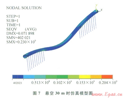 懸空30m時,仿真結果如圖7,在沿管軸方向(圖中x方向)的對稱中心處管道變形位移最大,在兩固支端、埋地與懸空的過渡處、對稱中心處應力集中較明顯,沿豎直方向(圖7中y方向)管道上部應力集中比管道下部明顯,最大應力為230MPa,小于屈服極限485MPa,所以管道處于安全范圍內。