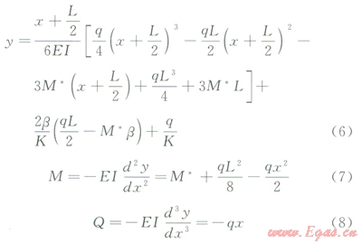 懸空段L:受埋地段兩端的拉伸、懸空與埋地過渡處下滑土的剪切、輸送介質重量和管道白重等力的作用。通過力學等效簡化,該段為當量軸向力(S0,)、彎矩(M0),剪力(Q0)、上部均布載荷(q)作用的大撓度梁。