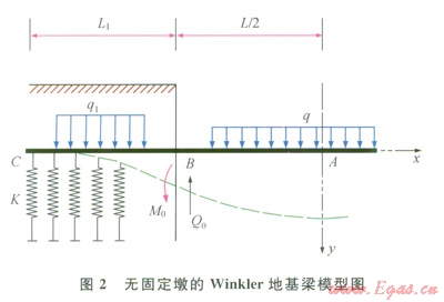 圖2為模型簡圖,與彈塑性地基模型相比,埋地段影響區(qū)為彈性變形區(qū)(無塑性變形)。管道變形前軸線為x軸,y軸過對稱中心,管道各截面的y坐標值為對應部分的管道撓度,任意截面的轉矩為M,M0和Q0是管道懸空段與埋地段交界處的彎矩和剪力。利用Winkler假定,通過懸管長度(L)、埋地管長(L1)、懸空段載荷(q)(管自重和介質重)、埋地段載荷q0(圖3中上覆土重q土=H·L·D·r土·g、管自重、介質重)、已知地基系數(K0),在對管道兩端固支的情況下求管道各微段的撓度(y)、轉矩(M)、豎直剪力(Q)值[8-10]。