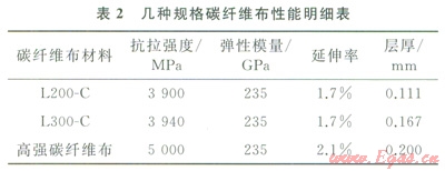 纖維強固材料(Fiber Reinforced Plastics,FRP)括:碳纖維(CFRP)、玻璃纖維(GFRP)和芳綸纖維(AFRP),碳纖維平均抗拉強度為4210MPa(相當于碳素鋼的l0倍),平均彈性模量為235×109MPa(與鋼材接近),熱膨脹系數與鋼材相仿,耐腐蝕、抗老化、耐溫、抗蠕變能力較好,且厚度小、質量輕、層間剪切力高、穩(wěn)定性好、纏繞方式靈活易操作,大量應用于航天、兵器、建筑和化工領域,表2列舉了3種碳纖維布[11]性能。