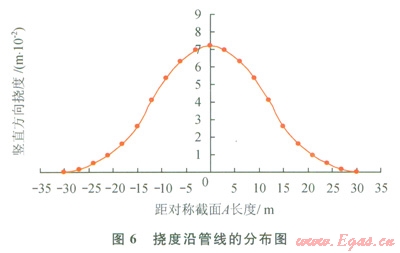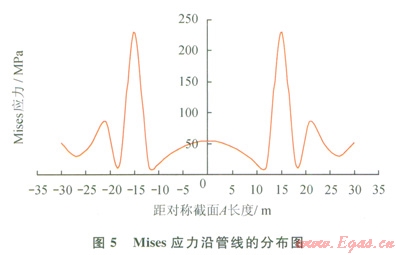 1)圖5、6表示了現場實際懸空長度為30m時,應力和撓度沿管線的分布情況,可見Mises應力和豎直方向應力在±15m處最大,而最大撓度出現在模型C-C處,也就是懸空水平對稱處。