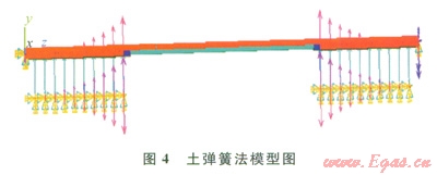 建立有限元物理模型時,將埋地管段所受到土壤支反力用一定間距的若干根彈簧代替,彈簧與管下表面呈點一面接觸。合理選取埋地管段長度,使管模型兩端不受懸空段的影響,從而實現管兩端的固支模型,一般工程上取單側埋地段長度為懸空段長度的l/2,這時管兩端可近似為固支[10](圖4)。