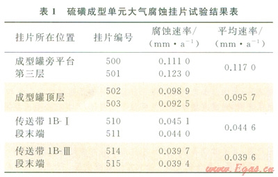 但在水造粒成型工藝中,液硫和硫磺顆粒本身具有腐蝕性,若液硫未脫氣或脫氣效果不好,則工藝介質(zhì)的酸性可能很強(qiáng),酸性濕氣進(jìn)入大氣中也具有一定的腐蝕性,對(duì)設(shè)備管線安全運(yùn)行構(gòu)成威脅。國(guó)內(nèi)專門(mén)針對(duì)硫磺成型設(shè)備的腐蝕雖已有報(bào)道[4-7],但對(duì)硫磺成型設(shè)備外部結(jié)構(gòu)鋼、閥門(mén)、硫磺顆粒傳送帶周?chē)摻Y(jié)構(gòu)的大氣腐蝕則未引起足夠的重視。經(jīng)過(guò)實(shí)地腐蝕調(diào)研,筆者發(fā)現(xiàn)硫磺成型單元外部結(jié)構(gòu)鋼、閥門(mén)、硫磺顆粒傳送帶周?chē)摻Y(jié)構(gòu)以及頂棚等都存在腐蝕隱患。本文采用現(xiàn)場(chǎng)掛片法對(duì)硫磺成型單元大氣腐蝕行為進(jìn)行分析,擬為凈化廠硫磺回收裝置的安全運(yùn)行提供技術(shù)依據(jù)。