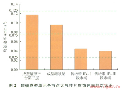1)高含硫凈化廠硫磺成型單元大氣腐蝕不可忽視,尤其在硫磺成型罐周?chē)?,因溫度較高、空氣濕度較大,加上液硫帶入的少量酸性氣,失重腐蝕速率超出凈化廠腐蝕控制標(biāo)準(zhǔn)。