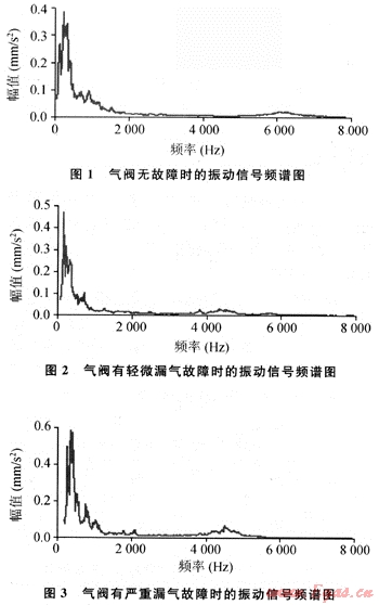 應(yīng)用上述理論方法對(duì)壓縮機(jī)氣閥典型故障下振動(dòng)信號(hào)進(jìn)行分析,試驗(yàn)數(shù)據(jù)來(lái)源于塔里木油田某壓縮機(jī),采集氣閥各典型故障下振動(dòng)信號(hào),采樣頻率FS=16000Hz,數(shù)據(jù)長(zhǎng)度N=61440,分別采集典型故障信號(hào)各5組,每組10個(gè)樣本。圖1~3分別為采集到的氣閥無(wú)故障、輕微漏氣、嚴(yán)重漏氣故障下的信號(hào)頻譜圖(因數(shù)據(jù)較多,僅列出每種典型故障下的1個(gè)振動(dòng)信號(hào)樣本的頻譜圖)。
