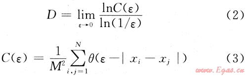 分形維數(shù)有Hausdaorff維數(shù)、相似維數(shù)、容量維數(shù)、信息維數(shù)、關(guān)聯(lián)維數(shù)等幾種形式[10],在機(jī)械設(shè)備故障診斷中一般是計(jì)算信號(hào)的關(guān)聯(lián)維數(shù)。若分形集合中某2點(diǎn)之間的距離為ε,其關(guān)聯(lián)函數(shù)為C(ε),則關(guān)聯(lián)維數(shù)為: