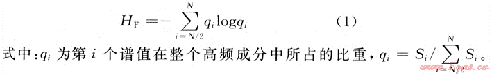 設(shè)Si為信號(hào)由時(shí)域變換到頻域所對(duì)應(yīng)的功率譜,那么S={S1,S2,…,SN)可看作是對(duì)原始信號(hào)的一種劃分,選定{SN/2,SN/2+1,…,SN)作為高頻成分,根據(jù)文獻(xiàn)[5]對(duì)信息熵的解釋,定義高頻譜熵HF為: