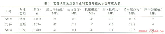 該作業(yè)使作用在井內(nèi)套管的內(nèi)壓力大幅度升高。四川盆地頁巖氣井Æl39.7mm油層套管固井后(套管壁厚9.17mm,井眼尺寸215.9mm)對套管柱試壓及壓裂作業(yè),井口壓力高達(dá)60MPa。N203井等井固井質(zhì)量優(yōu)質(zhì)率100%,但試壓或光套管壓裂作業(yè)后均出現(xiàn)環(huán)空帶壓。該區(qū)塊水泥石楊氏模量l0GPa,泊松比0.19,其余計算條件及結(jié)果如表l所示,由公式(1)和(2),試壓或壓裂作業(yè)后,套管壁處水泥環(huán)周向應(yīng)力均超過抗拉強度,發(fā)生拉伸破壞,導(dǎo)致水泥環(huán)密封失效。