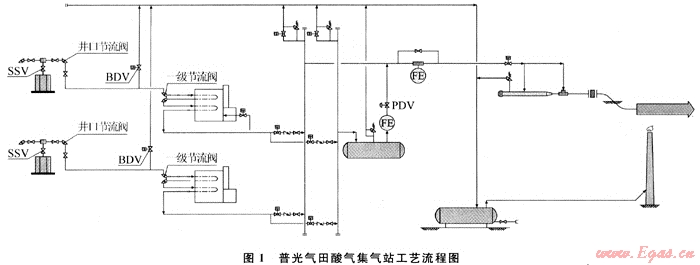 普光氣田集氣站的火炬有2種情況可能達到設(shè)計排放量,對照普光氣田集氣站工藝流程(見圖1[1])分析如下: