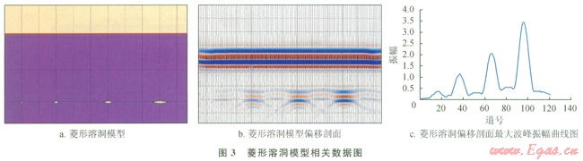 圖2-b是橢圓形溶洞偏移剖面,圖2-c為橢圓形溶洞最大波峰振幅曲線圖;圖3-b、圖3-c分別是菱形溶洞偏移剖面及最大波峰振幅曲線圖。可以看到,無論是橢圓形模型還是菱形模型,隨著溶洞橫向尺度的增加最大波峰振幅是增加的,這和長方形溶洞正演模擬結(jié)果很相似。