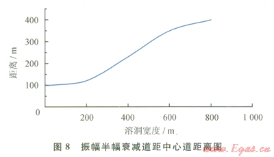 圖8為不同寬度溶洞反射的振幅衰減至最大振幅一半時對應(yīng)地震道距溶洞中心道的距離圖,這一屬性可以反映溶洞在剖面上的響應(yīng)寬度隨溶洞寬度的變化情況。從圖中可以看到,隨著溶洞寬度的增加,半幅衰減道與中心道距離是不斷增加的,增大幅度是先變大再變小,在菲涅爾帶半徑附近增大幅度達(dá)到最大。
