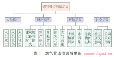 當(dāng)燃?xì)夤艿腊l(fā)生泄漏后,會(huì)給人員、財(cái)產(chǎn)、環(huán)境及社會(huì)帶來不同程度的影響。其后果就從人員、財(cái)產(chǎn)、環(huán)境及社會(huì)4方面來考慮,具體受影響因素參照?qǐng)Dl。