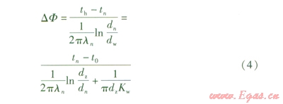 對于水平安裝供熱管道,設(shè)定絕熱層熱導率與方向無關(guān)且等于測點n方向的熱導率ln,根據(jù)式(3)與能量守恒定律,以測點所在圓為分界線,測點內(nèi)圓絕熱層與測點外圓絕熱層的熱流量相等。供熱管道單位長度熱損失DF可寫為: