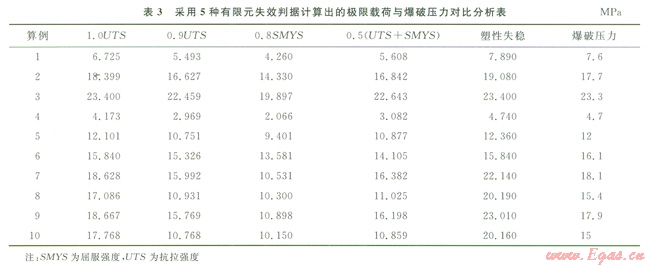 表3是采用5種失效判據(jù),即當(dāng)缺陷最深處沿壁厚方向中間節(jié)點(diǎn)的Von Mises等效應(yīng)力分別等于0.8UTS、0.9UTS、1.OUTS、0.5(UTS+SMYS)和塑性失穩(wěn)狀態(tài)時(shí)的管道內(nèi)表面所受壓力值為所得到的管道失效壓力。計(jì)算得出的極限載荷與真實(shí)爆破壓力進(jìn)行對比分析見圖4。