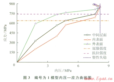 圖3為l0組爆破試驗(yàn)有限元計(jì)算的內(nèi)壓應(yīng)力曲線圖(以編號(hào)為l模型為例),取中間節(jié)點(diǎn)的曲線做插值計(jì)算。分別計(jì)算當(dāng)中間節(jié)點(diǎn)的Von Mises等效應(yīng)力等于0.8UTS、0.9UTS、1.OUTS、0.5(UTS+SMYS)和塑性失穩(wěn)時(shí)的壓力值。