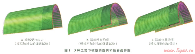1)經(jīng)過分析可知,3種工況下管道兩端的約束各不相同:加封頭的爆破試驗(yàn)管道兩端橫截面受軸向應(yīng)力;端部密封的爆破試驗(yàn)的管道兩端可以忽略管道兩端所受的軸向應(yīng)力,近似認(rèn)為不受約束;埋地長輸管道兩端沒有軸向應(yīng)力的約束,管道軸向位移為零。