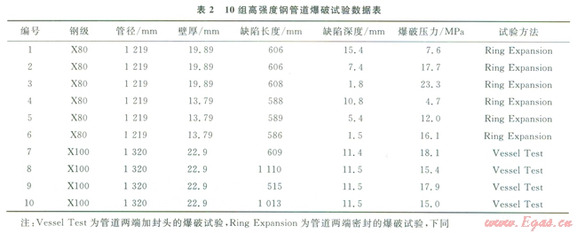 本節(jié)根據(jù)實(shí)際收集到的l0組高強(qiáng)度鋼管道爆破試驗(yàn)數(shù)據(jù)與有限元模擬計(jì)算結(jié)果進(jìn)行對比分析,確定適合高強(qiáng)度鋼管道的失效判據(jù)。