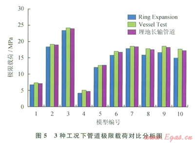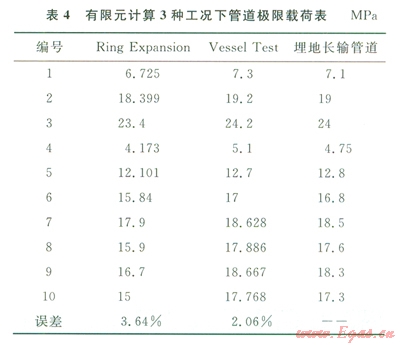 基于已確定的適合高強(qiáng)度管道的失效判據(jù),采用有限元分析方法模擬3種工況下管道的失效情況。圖5對3種情況下計(jì)算出的極限載荷做了對比分析。表4為3種丁況下管道極限載荷的對比值,通過對比分析可看出:加封頭的爆破試驗(yàn)與埋地管道的預(yù)測極限載荷吻合度更高,l0組誤差的標(biāo)準(zhǔn)偏差值為2.06%;兩端密封的爆破試驗(yàn)比埋地管道的預(yù)測極限載荷要小,l0組誤差的標(biāo)準(zhǔn)偏差值為3.64%。在實(shí)際工程試驗(yàn)中,建議用加封頭的爆破試驗(yàn)來預(yù)測埋地管道的極限載荷;用兩端密封的爆破試驗(yàn)來預(yù)測真實(shí)埋地管道的失效情況,得到的預(yù)測結(jié)果偏保守。