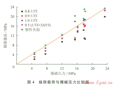 從圖4可以直觀地看}H:當(dāng)管道缺陷最深處的平均Von Mises等效應(yīng)力達(dá)到極限拉伸強(qiáng)度l.0UTS時(shí),計(jì)算出的管道極限載荷最接近真實(shí)爆破壓力值;當(dāng)Von Mises等效應(yīng)力等于0.8UTS、0.9UTS和0.5(UTS4-SMYS)時(shí)得到的極限載荷過于保守,都小于真實(shí)爆破壓力值;而當(dāng)達(dá)到塑性失穩(wěn)時(shí),得到的極限載荷值部分大于真實(shí)爆破壓力,具有不安全性。