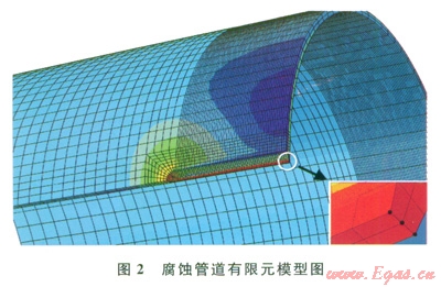 取在內(nèi)壓作用下管道腐蝕區(qū)域應(yīng)力最大處沿厚度方向的3個(gè)節(jié)點(diǎn),3個(gè)節(jié)點(diǎn)分別位于缺陷最深處沿壁厚方向的外表面、內(nèi)表面和中間層面(圖2)。