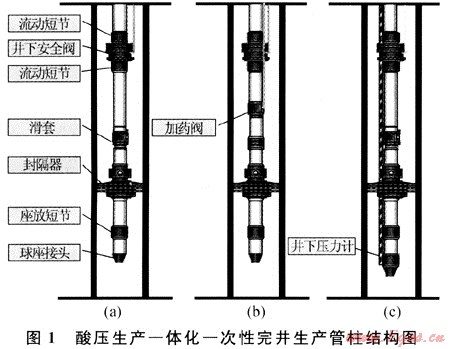 設(shè)計(jì)后的管柱結(jié)構(gòu)示意圖見(jiàn)圖1,油管用合金鋼防腐管,井下工具能滿足抗硫化氫腐蝕需要,耐溫150℃,耐壓70MPa,油管絲扣為金屬氣密封VAM TOP。圖1-a是不帶加藥閥和井下壓力計(jì)的生產(chǎn)管柱,一般在斜井和產(chǎn)量較高的井中使用;圖1-b是采用毛細(xì)管組成的能加注溶硫劑的生產(chǎn)管柱,在產(chǎn)量較低易產(chǎn)生硫沉積的氣井中使用;圖1-c是可實(shí)時(shí)監(jiān)測(cè)井底溫度和壓力的生產(chǎn)管柱,在井下又安裝了壓力、溫度傳感器,一般只在直井中采用。
