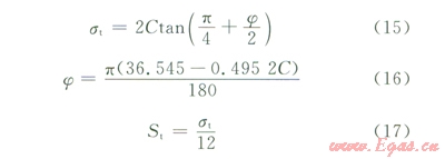 地層強(qiáng)度參數(shù)中對(duì)井壁穩(wěn)定性產(chǎn)生直接影響的是黏聚力和內(nèi)摩擦角,筆者認(rèn)為,黏聚力和內(nèi)摩擦角是巖石相互關(guān)聯(lián)的兩個(gè)強(qiáng)度參數(shù),地層強(qiáng)度的改變會(huì)導(dǎo)致二者同時(shí)發(fā)生變化,不應(yīng)將二者的影響單獨(dú)分析,而應(yīng)直接以單軸強(qiáng)度作為變化量進(jìn)行研究。假設(shè)地層強(qiáng)度參數(shù)服從關(guān)系式(15)[23],且黏聚力和內(nèi)摩擦角滿足經(jīng)驗(yàn)關(guān)系式(16)[24],則可用地層單軸抗壓強(qiáng)度同時(shí)表征黏聚力和內(nèi)摩擦角的變化。分析時(shí)還應(yīng)當(dāng)考慮地層強(qiáng)度變化對(duì)拉伸強(qiáng)度的影響,地層抗拉強(qiáng)度(St)與單軸抗壓強(qiáng)度(st)的關(guān)系由三維Griffith準(zhǔn)則[23]給出,滿足式(17)。