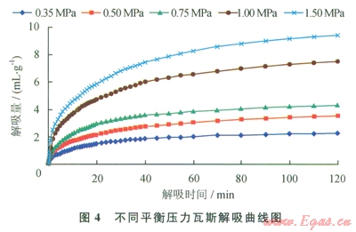 圖4為Xll064煤樣不同平衡壓力的解吸曲線,從該圖可以看出,隨著平衡壓力的增加,煤樣的解吸量明顯增大,解吸速度會隨時間逐漸放緩。
