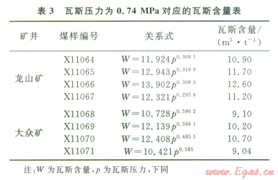 從實驗結(jié)果可以看出,瓦斯壓力和瓦斯含量具有指數(shù)關(guān)系,對圖2、3的瓦斯含量和瓦斯壓力數(shù)據(jù)擬合分析,可得出瓦斯壓力0.74MPa對應(yīng)的瓦斯含量(表3)。從該表可以看出,龍山礦無煙煤瓦斯壓力0.74MPa對應(yīng)的瓦斯含量為l0.9~12.6m3/t,平均為11.58m3/t;大眾礦貧煤對應(yīng)的瓦斯含量為9.04~10.7m3/t,平均為9.76m3/t。從實驗結(jié)果可以認為,龍山礦瓦斯含量在10.9m3/t就有可能具有突出危險性;而大眾礦瓦斯含量在9.04m3/t就可能發(fā)生突出。