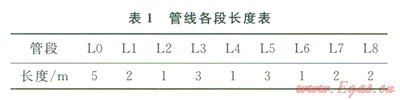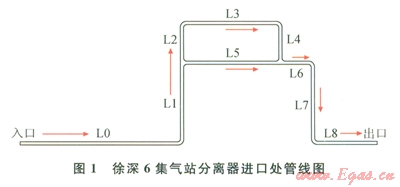 工況以大慶油田徐深6集氣站為例(圖1),管道材質(zhì)為20G,管徑為89mm,運(yùn)行壓力15.1MPa,溫度55℃,氣相中含水率為0.001336%。管線各段長(zhǎng)度見(jiàn)表l。
