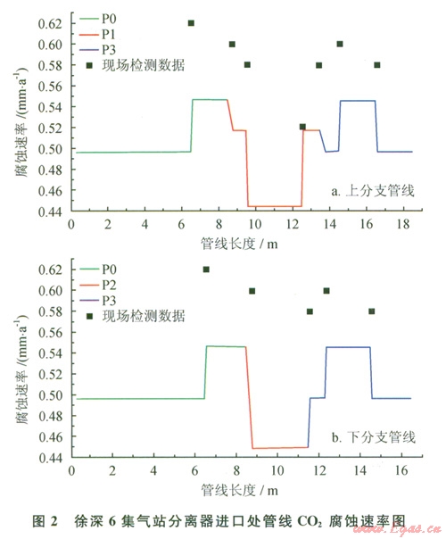 現(xiàn)場(chǎng)實(shí)際操作加入緩蝕劑(ZDl-l油氣井氣液兩相高級(jí)緩蝕劑)延緩管道的腐蝕,本文在Norsok經(jīng)驗(yàn)?zāi)P椭锌紤]了緩蝕劑的作用,引入影響因子對(duì)腐蝕速率進(jìn)行控制,對(duì)圖l所示管線進(jìn)行了腐蝕預(yù)測(cè)。將腐蝕預(yù)測(cè)結(jié)果在第一個(gè)T形管處分開(kāi)顯示。圖2給出了CO2分壓為0.0496MPa時(shí),上分支管線(表1中L0、Ll、L2、L3、L4、L6、L7與L8)與下分支管線(表1中L0、Ll、L5、L6、L7與L8)腐蝕模擬結(jié)果。