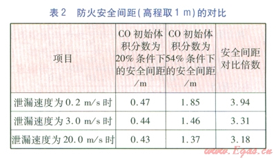 FLUENT軟件雖具有很高的權(quán)威性,但該空間模型還較簡單。危害氣體源僅考慮CO,忽略其他氣體(如H2)的影響??赏ㄟ^理論擴(kuò)散計(jì)算對微量泄漏工況進(jìn)行驗(yàn)證(無初速度和重力影響)。理論擴(kuò)散計(jì)算得知,對微量泄漏,2m高程處,C0體積分?jǐn)?shù)達(dá)到0.02%時(shí)7C0初始體積分?jǐn)?shù)為54%的安全間距是初始體積分?jǐn)?shù)為20%的安全間距的1.64倍,該值與其2m高程時(shí)的模擬安全間距對比倍數(shù)l.65極為接近,故可充分表明軟件模擬的置信性。