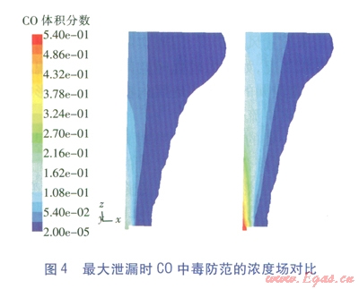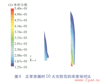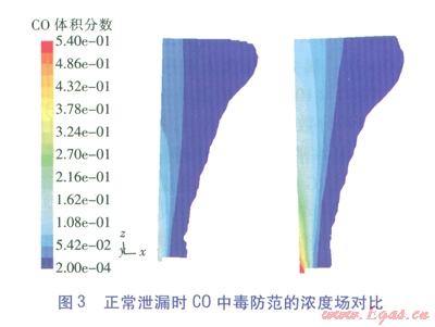 值得一提的是,火災(zāi)防范時(shí)只將爆炸極限列為危害區(qū)間,這符合不發(fā)生明火時(shí)的氣體冷態(tài)擴(kuò)散情況,但一旦發(fā)生燃燒,C0的濃度場將發(fā)生極大變化,還將產(chǎn)生對人員窒息的煙氣。FLUENT作為一款功能強(qiáng)大的軟件,也能模擬燃燒情況(俗稱熱態(tài)研究),但這將大大增加參數(shù)設(shè)定的復(fù)雜性和計(jì)算過程冗時(shí)性,這是工程計(jì)算力求避免的,但應(yīng)是理論研究的改進(jìn)方向。