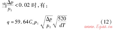 C是由生產(chǎn)廠家提出的調(diào)壓器的流通能力系數(shù),其物理意義為:在介質(zhì)密度ρ為1000kg/m3、壓差△p=0.0981MPa、調(diào)壓器全開的條件下,通過調(diào)壓器的流量,單位是m3/h。用戶根據(jù)需要的壓差和氣體的密度就可以用式(2)算出調(diào)壓器全開時的流量。