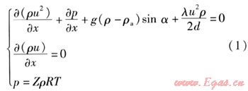 管道內(nèi)氣體流動數(shù)學(xué)模型由動量方程、連續(xù)性方程、狀態(tài)方程組成[10],見式(1)。因為管道內(nèi)溫度變化很小,所以不考慮能量方程。