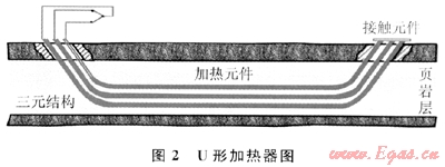 不同于Y形加熱器的位列方向,U形加熱器將3個加熱器在地面上以三角形方式水平排列(圖2)。該加熱器利用了較長的、大體上水平的加熱器支腿長度,可用來開采較薄層的油頁巖礦層,缺點是鉆多個水平井和斜向井,成本較高,不容易實施。