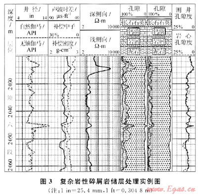 復雜巖性碳酸鹽巖儲層處理模塊是在雙礦物解釋程序發(fā)展起來的一個處理模塊,它考慮了中子曲線的含氣校正、聲波時差與孔隙度的非線性關(guān)系、巖性三角形的非正規(guī)排列等多個因素,使其更適用于一般碳酸鹽巖儲層的處理。