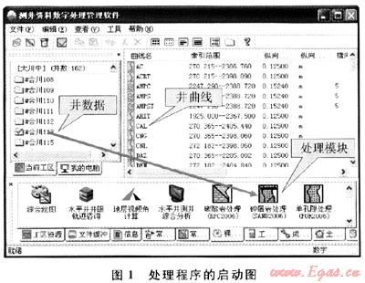 處理程序在設計時,應用了Windows系統(tǒng)的拖放功能實現(xiàn)對數(shù)據(jù)的調(diào)度,只要將井數(shù)據(jù)拖到相應處理模塊圖標上,則可應用該模塊進行處理(圖1)。