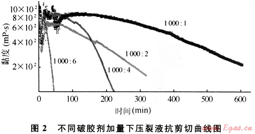 針對(duì)大規(guī)模加砂壓裂對(duì)壓裂液的要求,重點(diǎn)評(píng)價(jià)了壓裂液的抗長(zhǎng)剪切能力和徹底破膠性能。