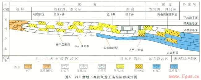 龍王廟期從盆地的西部到奉節(jié)—石柱—三匯—古藺一線發(fā)育內(nèi)緩坡相。盆地內(nèi)陸源物質(zhì)含量少,僅在盆地西部和西北部有少量沉積,發(fā)育潮坪亞相,主要巖性為紫紅色、褐灰色、灰色泥巖、砂巖,深灰色泥質(zhì)云巖、泥質(zhì)泥晶云巖,沉積動(dòng)力以潮汐的作用為主,能量一般不強(qiáng);川東凹陷區(qū),屬于內(nèi)緩坡的低洼地帶,因受兩側(cè)隆起區(qū)阻擋作用,水體循環(huán)不暢,以靜水沉積為主,鹽度略高,局部地區(qū)甚至出現(xiàn)咸化和蒸發(fā)作用,巖性以灰色、深灰色泥粉晶云巖、含泥質(zhì)條帶泥晶云巖為主,部分地區(qū)發(fā)育膏巖、鹽巖(如臨7井);川中川西寬緩隆起區(qū),是內(nèi)緩坡顆粒灘發(fā)育的主要地區(qū)。隆起區(qū)地形相對較高,在波浪、潮汐的作用下,水體能量較強(qiáng)的位置發(fā)育顆粒灘,巖性以灰色、深灰色亮晶砂屑云巖、殘余砂屑云巖、殘余礫屑云巖,以及細(xì)晶云巖為主,見少量鮞粒云巖及生屑云巖,交錯(cuò)層理發(fā)育,為顆粒灘亞相;在整個(gè)隆起區(qū),顆粒灘亞相與灘間海亞相具體發(fā)育區(qū)域很難加以區(qū)分,在橫向上多表現(xiàn)為灘間海發(fā)育于顆粒灘之間,縱向上夾于大套顆粒灘之間。灘間海亞相水體環(huán)境相對安靜,以細(xì)粒沉積為主,由生物擾動(dòng)泥晶云巖、含不規(guī)則泥質(zhì)紋層泥晶云巖和扁條狀泥晶云巖組成,發(fā)育條帶狀構(gòu)造、生物擾動(dòng)斑、生物潛穴構(gòu)造等是該亞相的典型特點(diǎn)。