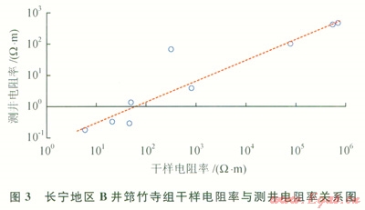 筆者將長寧B井筇竹寺組9個樣品點的井下測井電阻率與干樣電阻率進行對比發(fā)現(xiàn),樣品點的測井電阻率為0.177~457.93W·m,較干樣電阻率整體低2~4個數(shù)量級(表1),但與后者具有顯著的正相關性,測井電阻率在2W·m以下則對應的干樣電阻率小于100W·m(圖3)。另外,9個樣品點的測井電阻率與TOC同樣具有顯著的負相關性,在1860.96~1886.40m(富有機質頁巖段)呈現(xiàn)超低電阻特征(電阻率介于0.177~1.347W·m)(表1)。這表明,長寧筇竹寺組井下導電物質主要為有機質和頁巖孔縫中地層水,其中擁有高礦化度的地層水是導致測井電阻率整體低于干樣電阻率的重要介質。由于筇竹寺組下段為深水陸棚沉積,地層水物理化學性質在整個層段總體穩(wěn)定,而有機質豐度差異較大,僅在底部高伽馬段(192~615 API)較高,這表明長寧筇竹寺組底部出現(xiàn)的異常低電阻測井響應則主要是碳化后的有機質導電所致??梢?,利用極高成熟度、富有機質頁巖的超低電阻測井響應特征(電阻率小于2W·m)和干巖樣低電阻特征(電阻率小于100W·m),均可以直觀判斷有機質的碳化程度,進而評價烴源巖的質量。