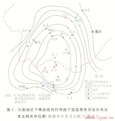 對筇竹寺組的勘探和研究程度遠不及龍馬溪組,所鉆的頁巖氣評價井僅4口(編號A、B、H、I),主要分布在川滇的威遠、長寧和鎮(zhèn)雄地區(qū),其他揭示寒武系頁巖的鉆井(編號D、E、F、G、J)皆為常規(guī)油氣勘探評價井(圖1)。鑒于烴源巖碳化呵能導致電測曲線出現(xiàn)低—超低電阻響應特征,筆者以筇竹寺組頁巖鉆井巖心、測井和分析測試資料為基礎,通過對富有機質頁巖干樣開展電阻率實驗測試以獲得有機質碳化的直接證據(jù),并以此對井下電阻率測井數(shù)據(jù)進行標定,進而利用測井電阻率響應對川南不同地區(qū)筇竹寺組的有機質碳化現(xiàn)象進行表征;同時結合與龍馬溪組電性、巖相、地球化學、吸附能力等相關資料的對比分析,探討不同程度的有機質碳化現(xiàn)象對頁巖氣賦存條件的影響,以探尋極高成熟度海相頁巖氣地質評價的新途徑,并據(jù)此為筇竹寺組頁巖氣資源戰(zhàn)略選區(qū)提供地質依據(jù)。