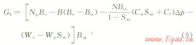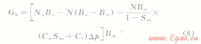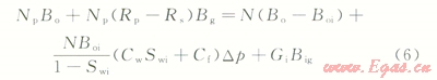 2)地面的累積產(chǎn)氣量為Gp,Gp=NpRp,Rp為累積生產(chǎn)氣油比。而在p壓力下累積產(chǎn)油量Np的溶解氣量為NpRs,Rs為p壓力下的溶解氣油比。因此,地層壓力由pi下降到p時(shí),由油藏中多產(chǎn)出的天然氣地下體積量為Np(Rp-Rs)Bg,Bg為p壓力下的天然氣體積系數(shù)。