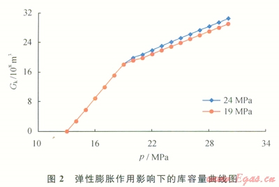 其次,由于地層壓力的降低,受地層巖石和束縛水的彈性作用的影響,會(huì)造成不可逆的孑L隙和裂縫體積縮小,從而影響庫(kù)容量。興古7古潛山油藏儲(chǔ)氣庫(kù)運(yùn)行壓力下限由24MPa降為19MPa時(shí),因受地層巖石和束縛水彈性膨脹的影響,地下儲(chǔ)氣庫(kù)庫(kù)容量將由30.52×108m3減少為29.01×108m3(圖2),損失了1.51×108m3,占總庫(kù)容量的4.94%。