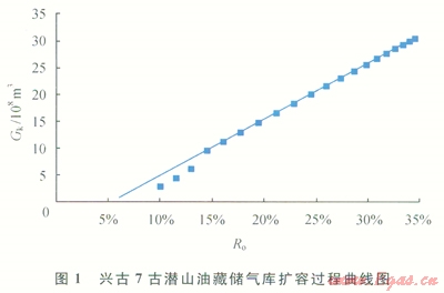 根據(jù)上述方法,計(jì)算了興古7古潛山油藏在氣驅(qū)開發(fā)過程中,油層中部深度地層壓力保持在27.25MPa下的原油不同采出程度(Ro)時(shí)所對(duì)應(yīng)的地下儲(chǔ)氣庫(kù)庫(kù)容量,當(dāng)油藏達(dá)到最終采收率為34.48%、地層壓力為30MPa時(shí),地下儲(chǔ)氣庫(kù)的庫(kù)容量為30.52×108m3(圖1)。